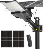 【Intelligent Control & Easy Installation】—The solar flood security light comes with a remote control, convenient for long-distance use. designed with always bright light mode and 10%-100% brightness adjustable. Comes with a set of wall and pole mount accessories that require no wiring for easy outdoor installation. Great for streets and roads, parking lots, basketball courts, garages, gardens, streets, courtyards, etc.